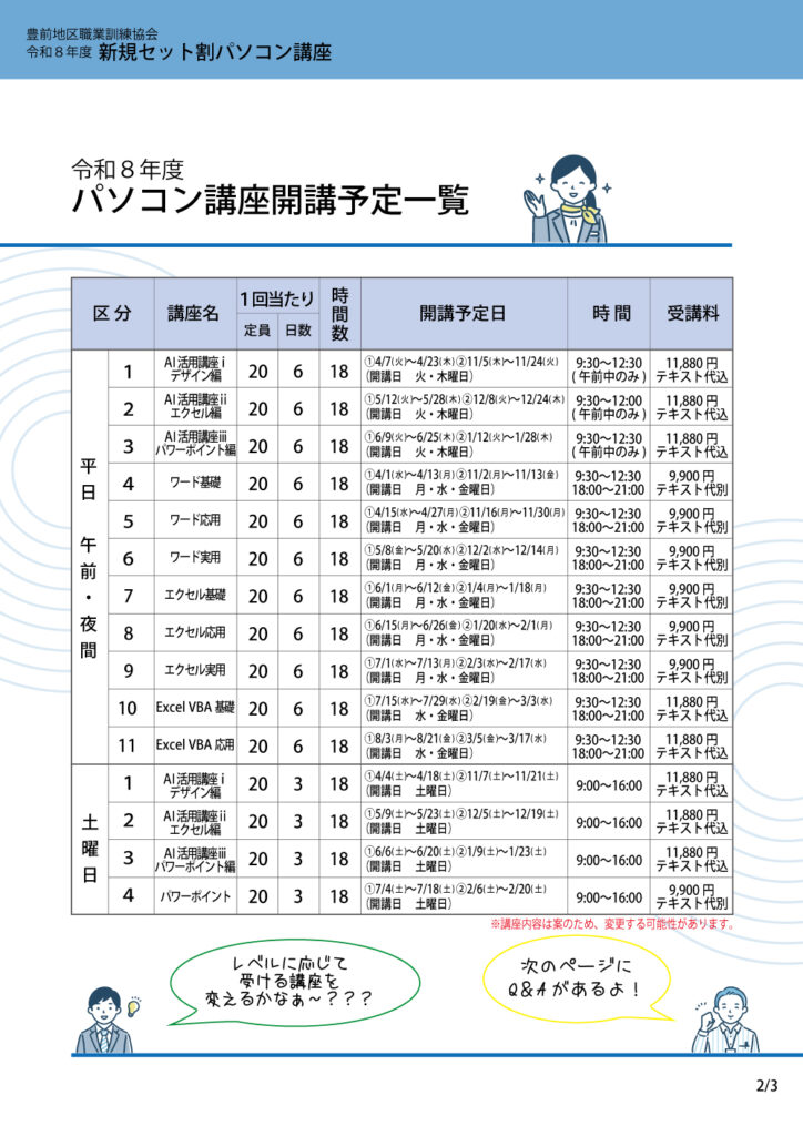 ※枠を購入して頂くことでAIならデザイン編・エクセル編・パワボの受講者入替自由!ワード・エクセルも基礎・応用・実用で受講者入替自由です。