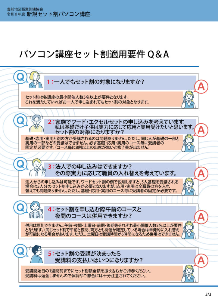 注意を各セット割は初回開催までに受講料のお支払いが必要です。また、各5枠以上の申し込みがないとセット割は摘要できません。